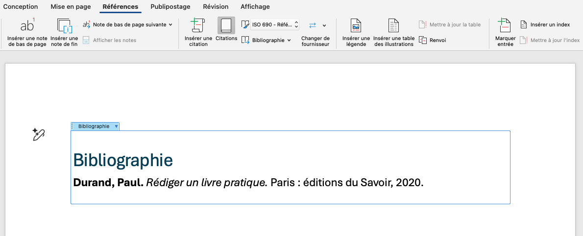 Retrouvez l’ensemble de vos citations dans Citations. Pour générer la bibliographie complète en fin de livre, cliquez sur Bibliographie.