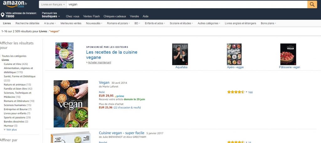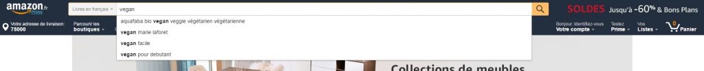 Imaginons que vous êtes à la recherche de mots-clés optimaux pour un livre de recettes de cuisine vegan. Recherchez sur les librairies en ligne, dans la catégorie « Livres en français », le mot-clé « vegan ». Le moteur de recherche propose plusieurs termes associés pendant que vous écrivez le mot. Ce sont les termes les plus recherchés par les lecteurs sur ce thème général « vegan ».
